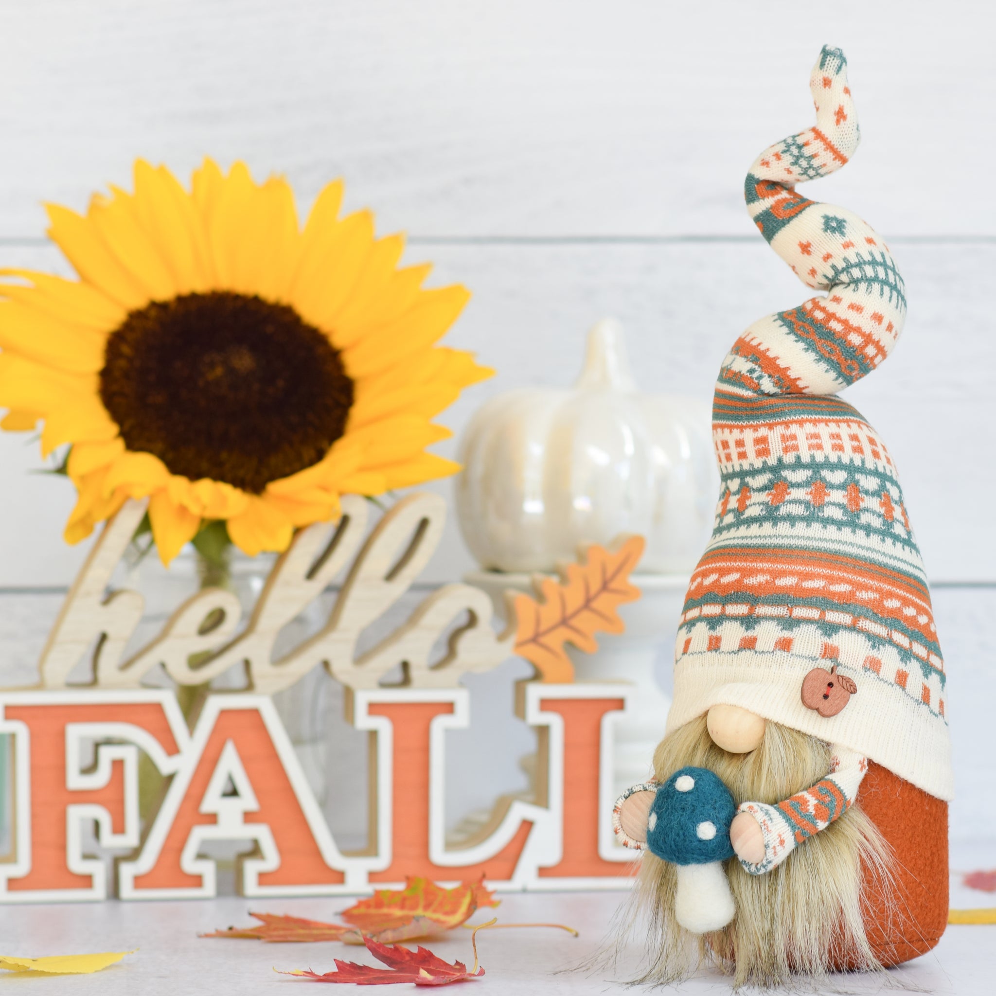This cozy harvest gnome is ready to welcome the fall season into your home. Dressed in a tall, patterned hat in the warm harvest tones of orange, green and cream he holds a felted mushroom in his hands—a sweet nod to woodland magic. His white beard, wooden nose, and little apple detail on his hat make him a charming addition to your seasonal décor. Perfect for mantels, tiered trays, or gifting to a gnome lover, this one-of-a-kind handmade gnome brings warmth and whimsy to any fall display.